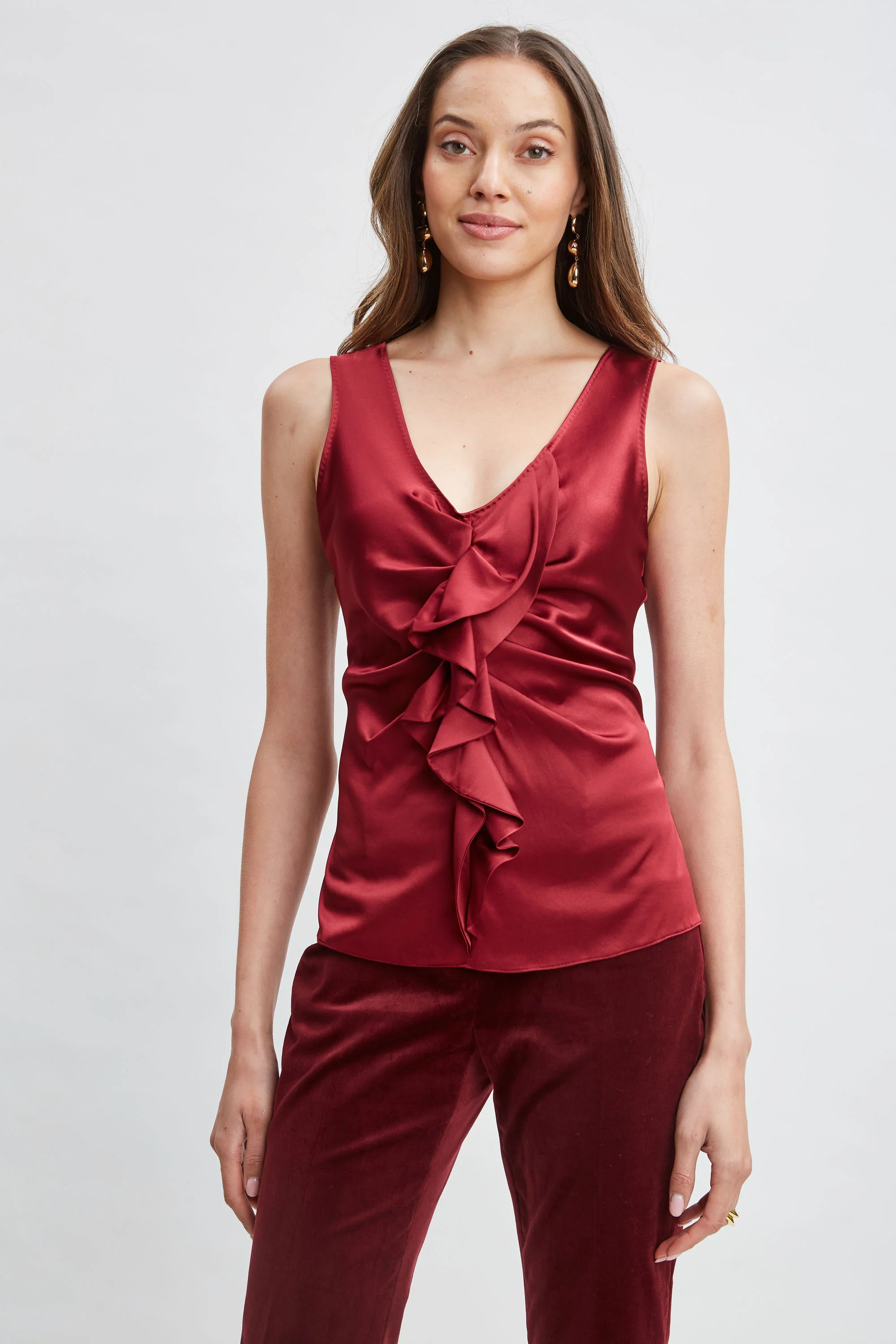 Silk Satin Sleeveless Ruffle Top